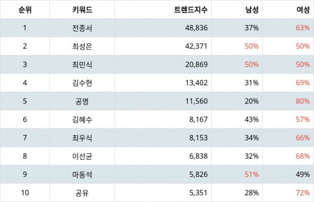 성별 선호도 분석 결과 1위 전종서는 남성 37%, 여성 63%, 2위 최성은은 남성 50%, 여성 50%, 3위 최민식은 남성 50%, 여성 50%가 선호하는 것으로 나타났다.