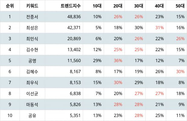 연령별 선호도에서는 전종서가 10대 10%, 20대 26%, 30대 26%, 40대 23%, 50대 15%로 나타났다.