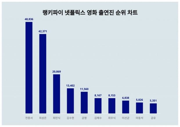 넷플릭스 영화 출연진 트렌드 지수는 전주 키워드 검색량과 구글트렌드 점수를 랭키파이가 자체적으로 합산해 산출한 지표이다.