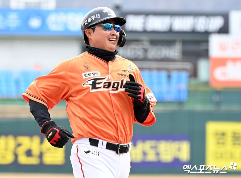 (엑스포츠뉴스 대전, 김한준 기자) 7일 오후 대전 한화생명이글스파크에서 진행되는 한화 청백전 경기, 한화 채은성이 득점 후 기뻐하고 있다.