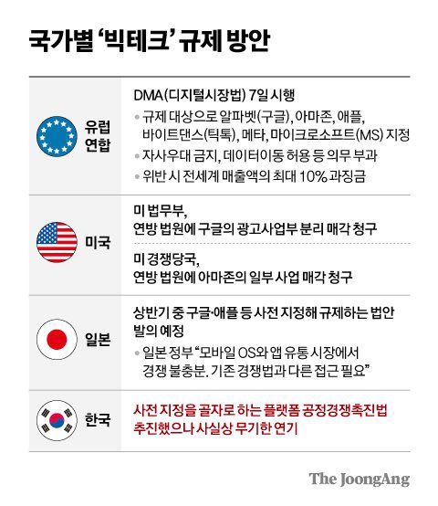 EU집행위는 지난 4일엔 애플에 18억 유로(약 2조6000억원)의 과징금을 부과했다. 애플이 아이폰‧아이패드 등을 통해 모든 앱을 구매하도록 강제하면서 애플뮤직에 유리한 환경을 만들었다는 이유다. 업계에선 DMA 시행을 앞두고 빅테크에 대한 선전포고 성격이 크다고 보고 있다.