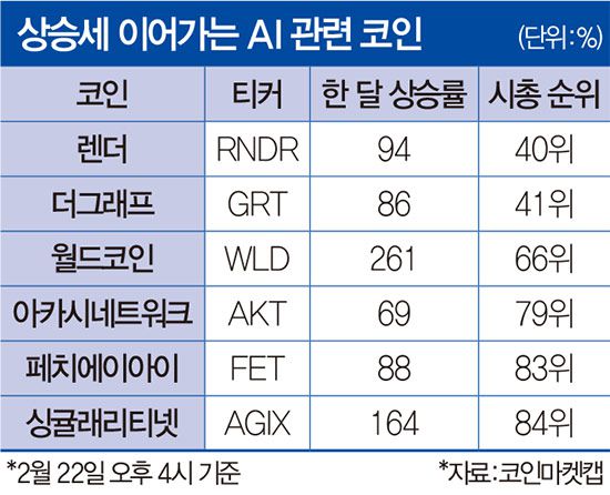 이 밖에도 사물인터넷 기기 같은 하드웨어와 AI를 연결한 집단 학습을 추구하는 페치에이아이(FET), 미사용 컴퓨팅 파워를 제공하고 보상을 받는 아카시네트워크(AKT), AI 개발자들이 저마다 AI 모델을 개방형 마켓에 공유하고 거래할 수 있도록 돕는 싱귤래리티넷(AGIX) 등도 대표적인 AI 코인으로 꼽힌다.