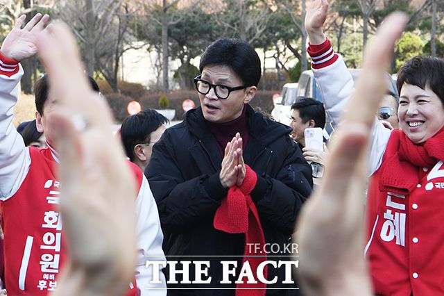 [더팩트ㅣ성남=배정한 기자] 한동훈 국민의힘 비상대책위원장(가운데)과 안철수 분당갑 후보(왼쪽), 김은혜 분당을 후보가 8일 오전 이재명 더불어민주당 대표가 거주하던 경기 성남시 분당구 양지마을 1단지 금호아파트를 방문해 시민들에게 지지를 호소하고 있다.