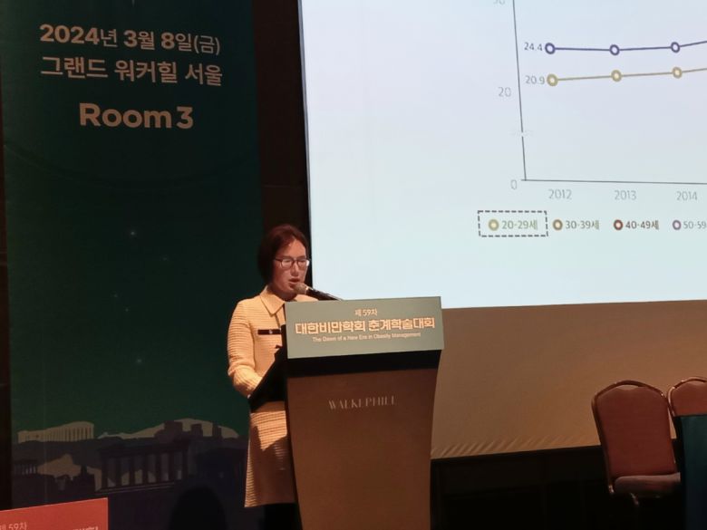 8일 서울 광진구 워커힐호텔에서 개최된 대한비만학회 춘계학술대회에 참석한 허연 을지대 의과대학 가정의학과 교수가 국내 비만 유병률에 대해 설명하고 있다. |