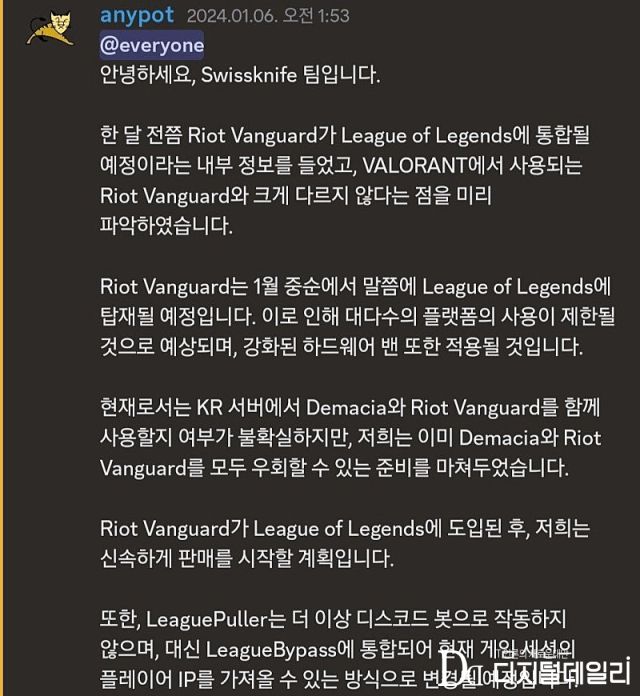 9일까지 <디지털데일리> 취재를 종합하면, 인플루언서와 LCK 등을 향한 이번 디도스 공격 배후는 ‘스위스나이프(SwissKnife)’가 유력한 것으로 알려졌다. 이들은 게임 음성 채팅 채널인 ‘디스코드’를 통해 제한된 인원들에게 여러 불법 프로그램을 판매하고 있다.