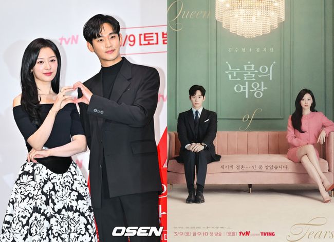 9일 첫 방송되는 tvN 새 토일드라마 ‘눈물의 여왕’ (극본 박지은/ 연출 장영우, 김희원/ 제작 스튜디오드래곤, 문화창고, 쇼러너스)은 퀸즈 그룹 재벌 3세이자 백화점의 여왕 홍해인(김지원 분)과 용두리 이장 아들이자 슈퍼마켓 왕자 백현우(김수현 분), 3년 차 부부의 아찔한 위기와 기적처럼 다시 시작되는 사랑 이야기를 담은 드라마다.