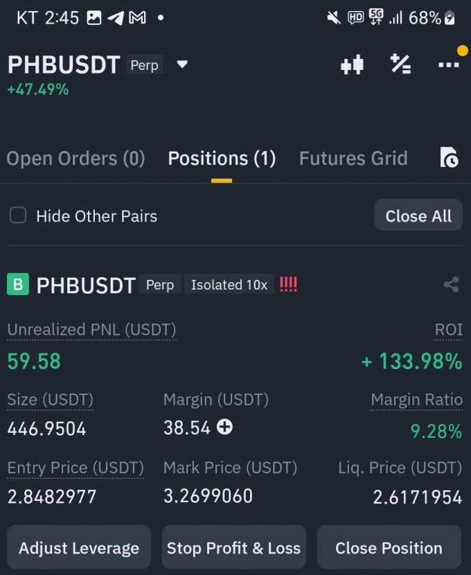 피닉스가 전날보다 50% 정도 오르며 바이낸스 상승률 1위를 기록하던 7일 밤 10시30분 무렵 기자는 38.5USDT(한화 5만1700원·1USDT는 1달러 가치에 연동되며 선물 거래용으로 쓰임) 의 증거금을 내고 피닉스를 매수(롱 포지션)했다. 그로부터 20분도 안돼 바이낸스 거래 정보창의 투자수익률(ROI)은 40% 가까운 평가액 손실을 가리켰다.