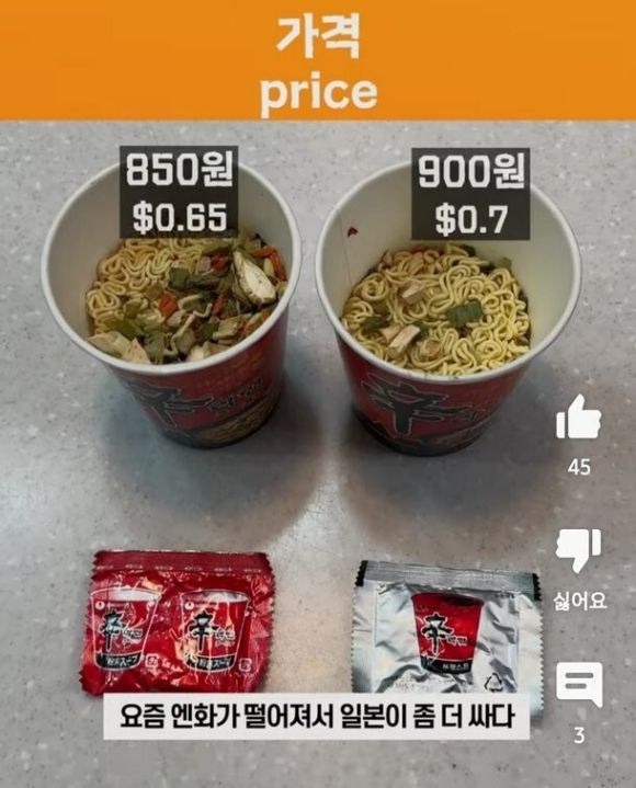 영상을 보면 일본에서 구입한 신라면은 개당 0.65달러(858원), 한국 신라면은 개당 0.7달러(924원)로 표시돼 있다.