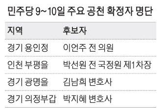 문희상 전 국회의장의 아들인 문석균 김대중재단 의정부지회장은 민주당 경선에서 졌다. 오영환 의원의 불출마 선언에 따라 전략지역으로 지정돼 지난 8~9일 치러진 경기 의정부갑 경선에서 문 지회장은 당 영입인재 1호인 박지혜 변호사에게 패배했다. 현역인 김민철 의원의 컷오프(공천 배제)로 역시 전략지역으로 지정된 경기 의정부을에선 이재강 전 경기도 평화부지사가 권혁기 당 대표실 정무기획실장과 임근재 예비후보를 꺾었다. 컷오프된 변재일 의원 지역구인 충북 청주청원에서는 송재봉 전 청와대 행정관이 신용한 전 서원대 교수를 꺾고 본선에 올랐다. 송 전 행정관은 김수민 전 국민의힘 의원과 대결한다.