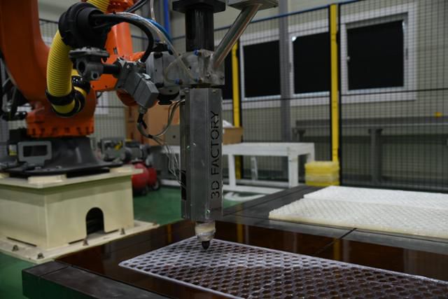 초대형 3D프린팅 전문기업 쓰리디팩토리가 개발한 다관절로봇 형태 3D프린터가 5일 부두에 쓰이는 방충재를 제작하고 있다. 울산=박은경 기자