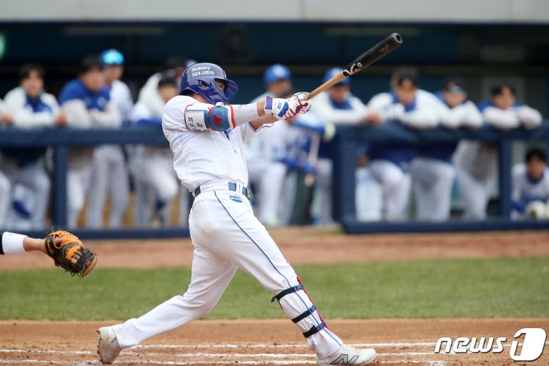 (대구=뉴스1) 공정식 기자 = 11일 오후 대구 삼성라이온즈파크에서 열린 프로야구 '2024 신한은행 SOL KBO리그' LG 트윈스와 삼성 라이온즈의 시범경기, 6회말 1사 1루 상황 삼성 5번타자 김재성이 LG 성동현을 상대로 우월 2점홈런을 때리고 있다. 2024.3.11/뉴스1