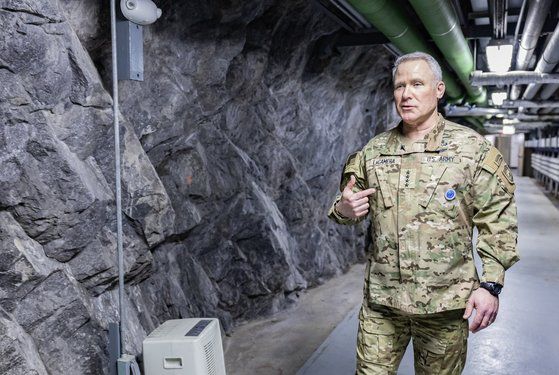지난 9일 육·해·공 전구작전지휘소 CP 탱고(Command Post Theater Air Naval Ground Operations)의 화강암 터널에서 인터뷰하는 폴 러캐머라 한미연합사령관(주한미군사령관 겸직). 러캐머라 사령관은 “북한의 위협은 계속 진화하지만, 어떤 위협에도 대비하겠다”고 강조했다. 수도권 야산에 굴을 파고 만든 지하벙커 CP 탱고는 최대 500명이 두 달간 숙식할 수 있고, 두꺼운 콘크리트와 이중 철문으로 보강해 전술핵 공격에도 견딜 수 있도록 설계 됐다고 한다. CP 탱고가 한국 언론에 공개된 건 처음이다.