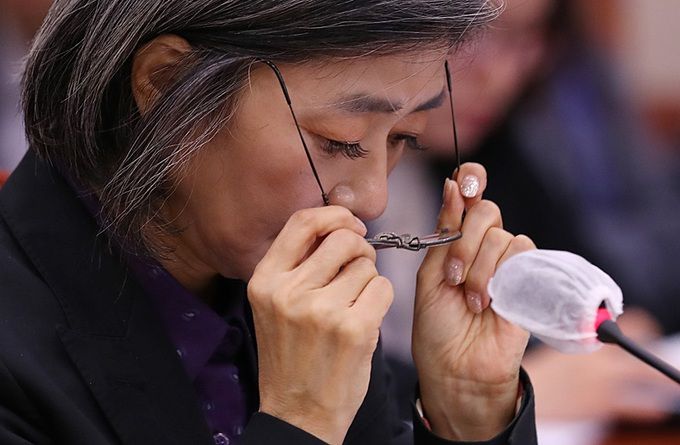 지난해 10월5일 당시 김행 여성가족부 장관 후보자가 서울 여의도 국회에서 열린 인사청문회에 참석해 안경을 착용하고 있다. 뉴시스