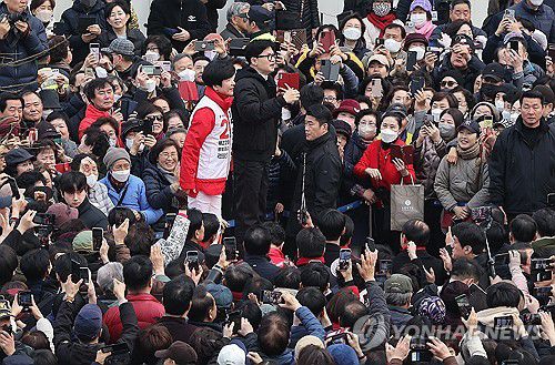 (서울=연합뉴스) 한종찬 기자 = 국민의힘 한동훈 비상대책위원장이 12일 오후 서울 영등포구 타임스퀘어 앞 광장에서 시민들에게 인사하고 있다. 2024.3.12 [공동취재]