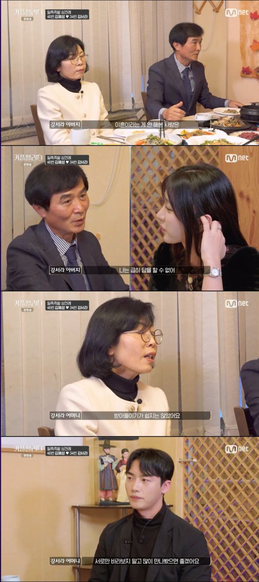 강서라의 어머니는 “서라 아빠나 저나 보수적인 사람이다. 솔직히 받아들이기가 쉽지는 않았다”라며 돌싱이라는 점이 걸린다고 솔직하게 밝혔다. 이어 강서라의 어머니는 여러 명을 만나보고 신중하게 고려했으면 좋겠다고 언급했다.