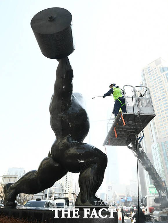 이날 황사와 미세먼지, 매연 등으로 오염된 잠실 새내역 중앙 분리대 근처 조형물을 고압 세척기를 이용해 물청소 했다.