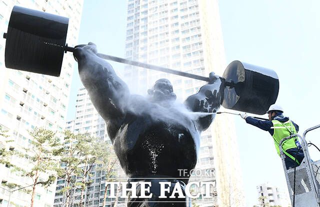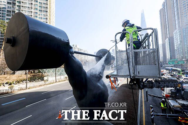 [더팩트ㅣ박헌우 기자] 서울 송파구청(구청장 서강석)이 13일 오전 서울 송파구 잠실새내역 인근에서 봄맞이 올림픽 상징 조형물 세척을 하고 있다.