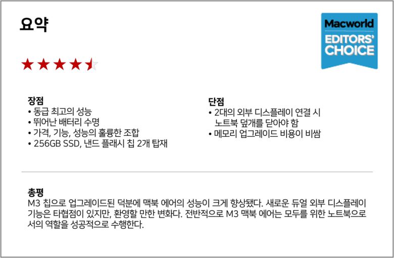 이제 맥북 에어는 애플이 작년 가을부터 시작한 ‘M3 축제’에 합류했다. 칩 업그레이드 외에 새로운 M3 맥북 에어에는 두 가지 새로운 기능만 추가되었을 뿐 사실상 이전과 동일한 노트북이다. 많은 부분이 변하지 않은 것처럼 제품에 대한 필자의 인식도 변함없다. 맥북 에어는 여전히 누구에게나 최고의 노트북이다.