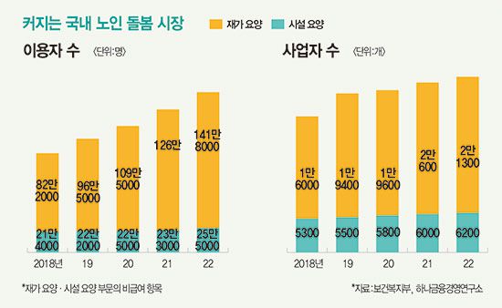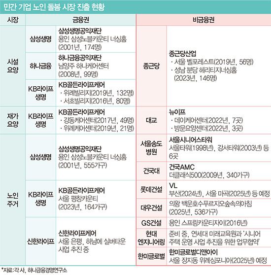 시니어 돌봄 시장에 적극적인 곳은 금융권이다. 현행법에 따라 금융권에서는 보험사를 통해야 장기요양 서비스 사업을 할 수 있다 보니 보험사를 주축으로 시장에 진출하는 모습이다.