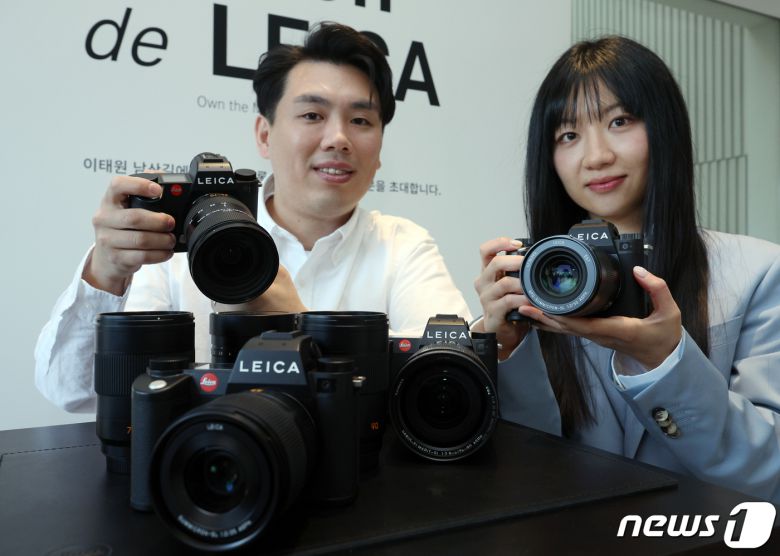 (서울=뉴스1) 박정호 기자 = 14일 오전 서울 용산구 회나무로 더 플랫 스튜디오에서 열린 독일 명품 카메라 라이카 신제품 SL3 출시 행사에서 모델들이 제품을 소개하고 있다. 100년 전통의 라이카 카메라(Leica)의 SL3는 3단계 해상도 조절 기술이 적용된 BSI CMOS 풀 프레임 센서로 최대 6,000만 화소를 구현했으며, 위상차 (PDAF), 물체 감지 (Object Detection AF), 콘트라스트 (Contrast Detection AF) 세 가지 기술이 결합된 자동 초점 시스템과 지능형 피사체 인식은 희박한 빛 속의 촬영부터 동적인 액션 촬영까지 다양한 촬영 환경과 함께 새로운 마에스트로-IV 프로세서를 탑재해 뛰어난 노이즈 제어 성능뿐만 아니라 높은 색 재현력의 결과물을 만들어 낸다. 2024.3.14/뉴스1