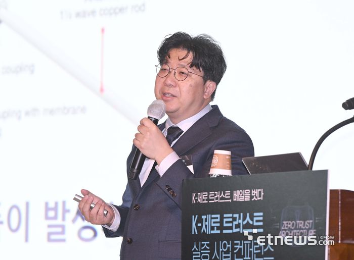 K-제로 트러스트 실증 사업 콘퍼런스가 14일 서울 강남구 GS타워에서 열렸다. 이석준 가천대 교수가 '제로 트러스트 가이드라인 해설'에 대해 발표하고 있다. 박지호기자 jihopress@etnews.com