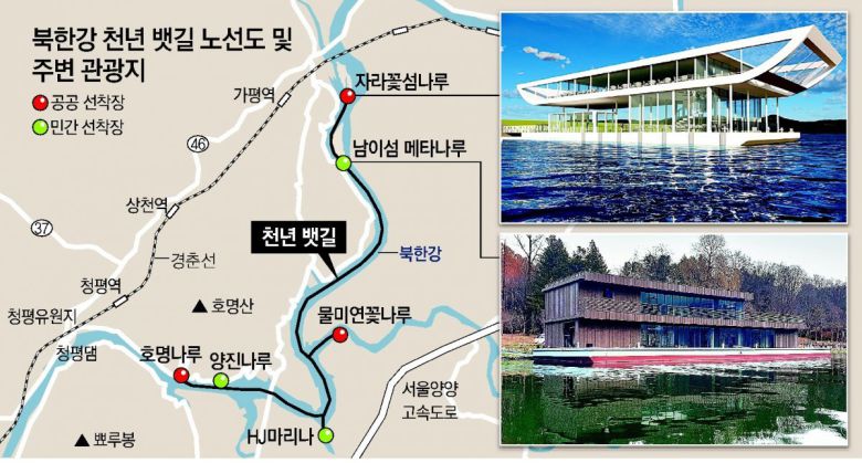 봄·가을 꽃축제가 열리는 자라섬 남도 꽃동산 등 볼거리가 풍성하다. 수상레저타운, 청평호, 청평유원지 등이 자리하고 있어 수상 관광을 즐기기도 좋다. 서태원 가평군수는 “북한강 천년 뱃길 개통으로 수변에 흩어진 천혜의 관광지를 수상 교통망이라는 새로운 노선과 연계할 수 있게 됐다”며 “수상 관광 1번지 가평으로 한 단계 더 도약하는 계기가 될 것”이라고 말했다.