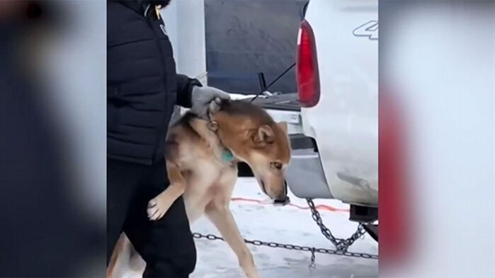 남자 한 명이 눈길에 축 늘어진 개를 어떻게든 일으켜 세우려고 애를 씁니다.