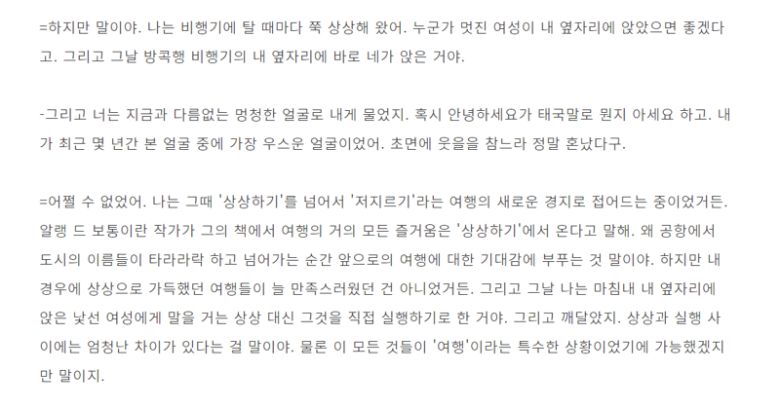 어쩔 수 없었어. 나는 그때 '상상하기'를 넘어서 '저지르기'라는 여행의 새로운 경지로 접어드는 중이었거든. 알랭 드 보통이란 작가가 그의 책에서 여행의 거의 모든 즐거움은 '상상하기'에서 온다고 말해. 왜 공항에서 도시의 이름들이 타라라락 하고 넘어가는 순간 앞으로의 여행에 대한 기대감에 부푸는 것 말이야. 하지만 내 경우에 상상으로 가득했던 여행들이 늘 만족스러웠던 건 아니었거든. 그리고 그날 나는 마침내 내 옆자리에 앉은 낯선 여성에게 말을 거는 상상 대신 그것을 직접 실행하기로 한 거야. 그리고 깨달았지. 상상과 실행 사이에는 엄청난 차이가 있다는 걸 말이야. 물론 이 모든 것들이 '여행'이라는 특수한 상황이었기에 가능했겠지만 말이지.