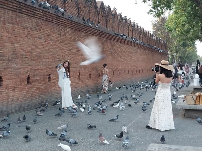 치앙마이 구 도심 동쪽에 위치한 타패게이트에서 관광객들이 비둘기와 함께 사진을 찍고 있다. 사진 이환주 기자. |