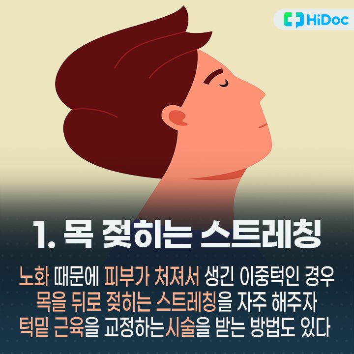 젊었을 때는 이중턱이 없다가 나이가 들면서 생긴 경우 노화로 인해 피부와 근육이 처진 것일 수 있다. 턱을 받치고 있는 ‘활경근’이라는 근육이 늘어져 턱밑을 제대로 받쳐주지 못하면 이중턱이 생기는 것이다. 이때 턱밑 근육의 늘어진 근육을 교정하면 이중턱을 개선할 수 있다. 평소 목을 젖히는 스트레칭을 자주 하는 것도 이중턱 개선에 도움이 된다.