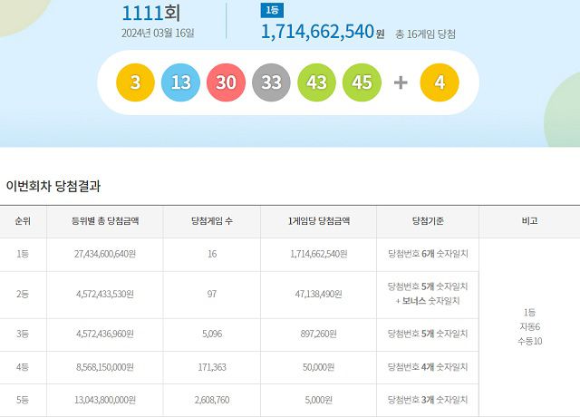 16일 오후 복권수탁사업자 동행복권이 추첨한 1111회 로또복권 조회 결과 1등 당첨번호 6개 모두 맞힌 16명(또는 13명)은 각 17억1466만원을 수령한다. 1등 당첨 구매 방식은 자동 6명, 수동 10명(또는 7명)이다.