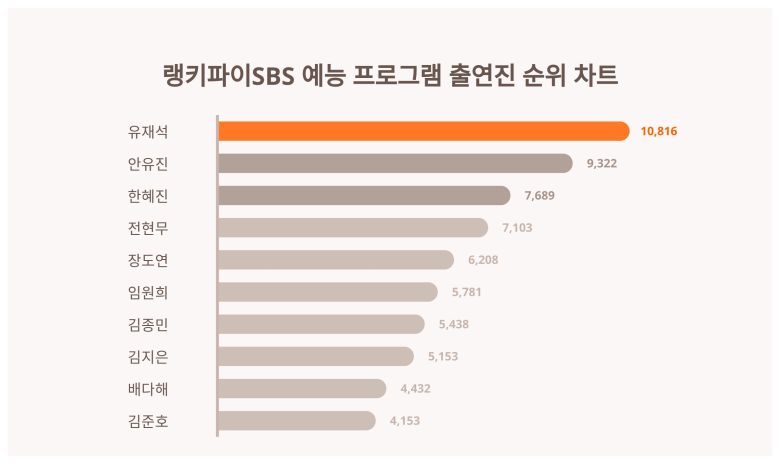 순위 키워드 트렌드지수 남성 여성 1 유재석 10,816 52% 48% 2 안유진 9,322 54% 46% 3 한혜진 7,689 41% 59% 4 전현무 7,103 36% 64% 5 장도연 6,208 38% 62% 6 임원희 5,781 56% 44% 7 김종민 5,438 52% 48% 8 김지은 5,153 59% 41% 9 배다해 4,432 31% 69% 10 김준호 4,153 39% 61% [출처: 랭키파이 인물 SBS 예능 프로그램 출연진 트렌드 테이블]