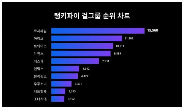 4위 뉴진스는 9,889포인트, 5위 에스파는 7,931포인트, 6위 엔믹스는 4,642포인트, 7위 블랙핑크는 4,427포인트, 8위 우주소녀는 3,371포인트, 9위 레드벨벳은 2,325포인트, 10위 소녀시대는 2,152포인트이다.