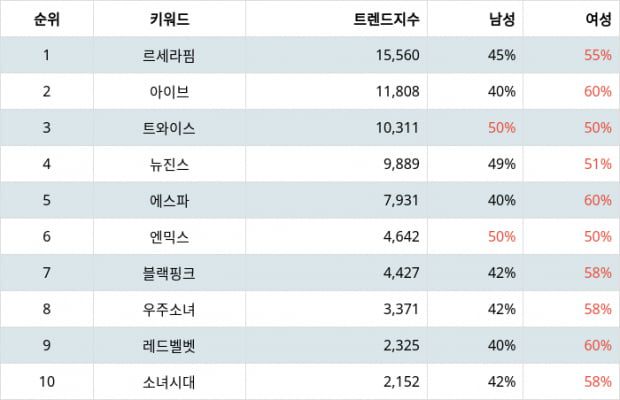 성별 선호도 분석 결과 1위 르세라핌은 남성 45%, 여성 55%, 2위 아이브는 남성 40%, 여성 60%, 3위 트와이스는 남성 50%, 여성 50%가 선호하는 것으로 나타났다.
