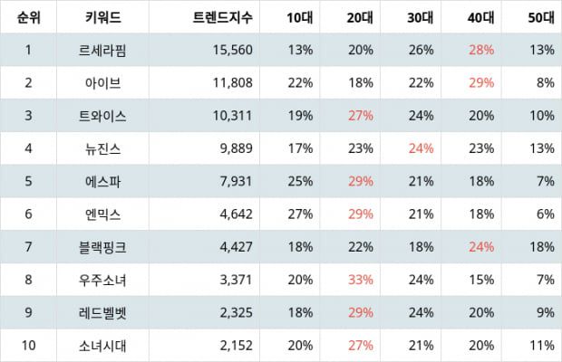연령별 선호도에서는 르세라핌이 10대 13%, 20대 20%, 30대 26%, 40대 28%, 50대 13%로 나타났다.