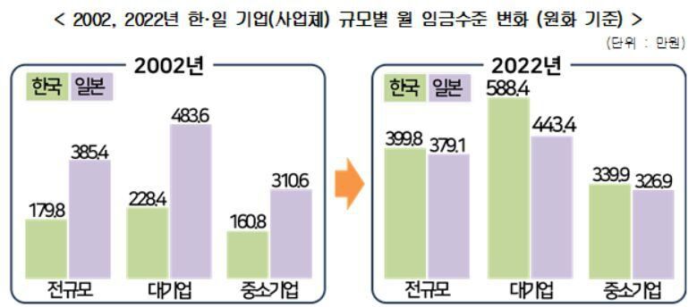 다만, 대·중소기업 간 임금 격차의 경우, 한국이 일본보다 더 컸다. 2022년 대기업 임금을 100으로 할 때 중소기업 임금은 한국이 57.7로, 2002년(70.4)에 비해 오히려 12.7%포인트 낮아졌다. 반면, 일본은 2002년 64.2에서 2022년 73.7로 높아졌다. 이는 한국의 대기업 임금 인상률이 급격하게 높아진 영향이 큰 것으로 분석된다.
