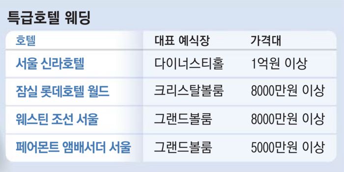 주요 5성급 호텔의 예식당 이용은 기본 수천만원에서 시작한다. 서울의 한 특급호텔은 예식장 이용 금액이 최소 1억원에 근접(하객 400명 기준)하는 것으로 알려졌다. 이 호텔 관계자는 “옵션을 가장 기본으로 하면 9000만원대 중반부터 가능하다”며 “꽃 장식이나 식사 등 각종 옵션에 따라 많게는 2억5000만원까지 올라간다”고 말했다.