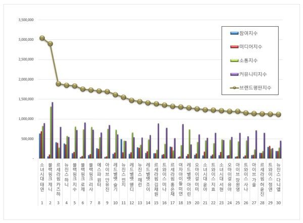 2024년 3월 걸그룹 개인 브랜드평판 30위 순위는 소녀시대 태연, 블랙핑크 제니, 르세라핌 카즈하, 뉴진스 하니, 블랙핑크 지수, 블랙핑크 로제, 블랙핑크 리사, 에스파 윈터, 아이브 안유진, 레드벨벳 슬기, 뉴진스 민지, 레드벨벳 웬디, 뉴진스 해린, 레드벨벳 조이, 르세라핌 김채원, 트와이스 미나, 르세라핌 홍은채, 여자아이들 미연, 레드벨벳 아이린, 오마이걸 미미, 소녀시대 윤아, 트와이스 지효, 소녀시대 서현, 오마이걸 유아, 아이브 장원영, 트와이스 사나, 아이브 가을, 르세라핌 허윤진, 트와이스 정연, 뉴진스 다니엘 순으로 분석됐다.