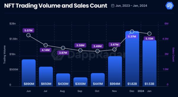 18일 가상자산 업계에 따르면 비트코인 가격 상승과 맞물려 NFT 거래대금이 증가했다. 가상자산 데이터 제공업체 댑레이더에 따르면 지난해 12월부터 지난 2월까지 NFT 거래대금은 10억달러대 중후반을 유지하고 있다. 거래량도 지난해 12월부터 500만건을 유지하고 있다. 지난 3일부터 17일까지 NFT 거래대금도 7억5000만달러를 넘겼다.