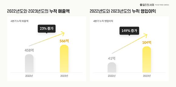 밀리의 서재(대표 서영택)는 2023년 매출 566억원, 영업이익 104억원을 기록했다고 20일 공시했다. 이는 전년 대비 각각 23%, 149% 증가한 수치다.