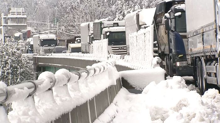 제설차가 눈을 치우고 도로에 염화칼슘을 뿌린 뒤에야 화물차들이 이동할 수 있게 됐습니다.