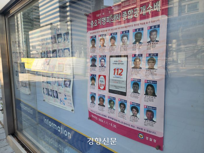 경찰의 2024년 중요지명피의자 종합공개수배 전단이 21일 서울 서대문구 미근동 경찰청 인근 게시판에 붙어 있다. 지난 15일 검거된 윤모씨(50)의 사진은 검거 직후 가려졌다. 강은 기자