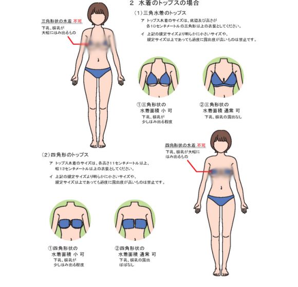 협회는 이 외에 또 다른 파일도 첨부했다. 여기에는 ‘젖꼭지나 성기가 노출되는 수영복 또는 그럴 가능성이 있는 수영복 착용은 금지’ 등이라는 문구와 함께 다양한 이미지가 담겼다. 수영복 상의, 하의의 자세한 착용 규정과 사진 촬영 시 금지하는 자세를 여성의 이미지로 설명한 것인데, 산케이신문은 “너무 자세하게 표현됐다는 지적이 나오고 있다”고 전했다.