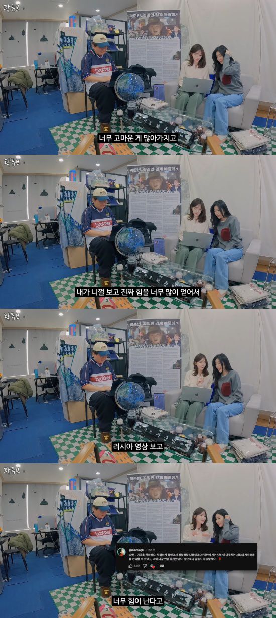 그는 "내가 네 걸 보고 코로나 때 진짜 힘을 많이 얻어서. 러시아 영상 보고 준빈이가 사람들한테 막 알려지기 시작할 때 나도 그 중에 한 사람이었다"며 "근데 내가 이렇게 '너무 힘이 난다', '힘내라'고 댓글을 많이 달았었다. 그래서 내가 (준빈이 채널을) 엄청 좋아했다"고 이야기했다.