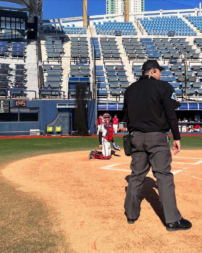 주심이 자동투구판정시스템(ABS)으로 판독된 볼-스트라이크 결과를 듣기 위해 이어폰을 착용하고 있다. 사진=KBO