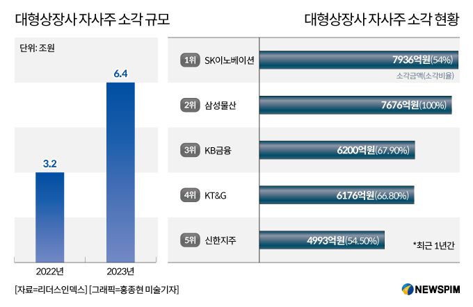 정부의 '기업 밸류업 프로그램' 발표 이후 전문가들은 기업들의 자사주 소각 규모가 10조원을 돌파할 것이라고 내다봤다. 리더스인덱스에 따르면 대형상장사의 자사주 소각 규모는 2022년 3조2000억원에서 지난해 6조4000억원으로 두 배 이상 증가했다. 여기에 정부가 법인세·배당소득세 감면 카드를 내세운 만큼 10조는 거뜬히 넘길 것이라는 전망이다.