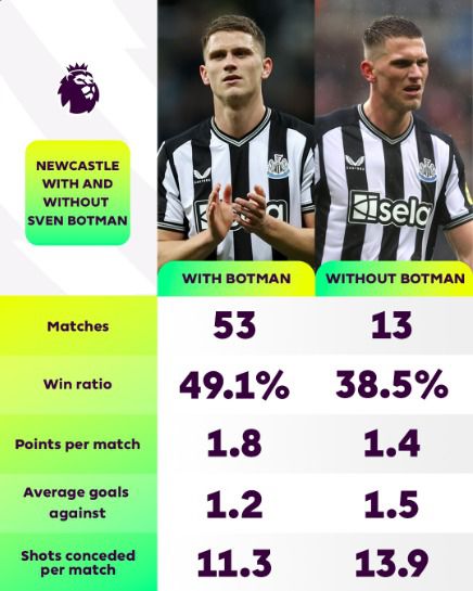한편, PL은 보트만의 부상 소식을 전하면서 보트만의 출전 여부에 따른 뉴캐슬의 성적을 조명했다. 뉴캐슬은 보트만이 나온 53경기에서 49.1%의 승률을 보여줬고 경기 당 승점이 1.8점이었다. 실점은 경기 당 1.2였고 경기 당 슈팅 허용은 11.3개였다. 반면, 보트만이 없던 13경기에서는 승률은 38.5%였고 경기 당 승점은 1.4점이었다. 경기 당 실점은 1.5점, 경기 당 슈팅 허용은 13.9개였다. 뉴캐슬은 보트만 없이 남은 시즌을 잘 마무리해야 한다.