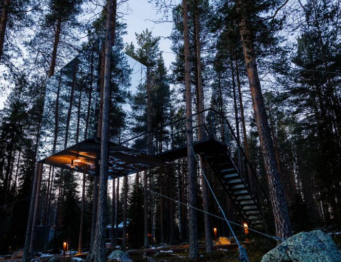 미러큐브는 외관의 모든 면이 거울로 된 방이다. 숲을 보호하기 위해 한 그루의 나무도 베어내지 않고 지은 트리 호텔의 풍경.