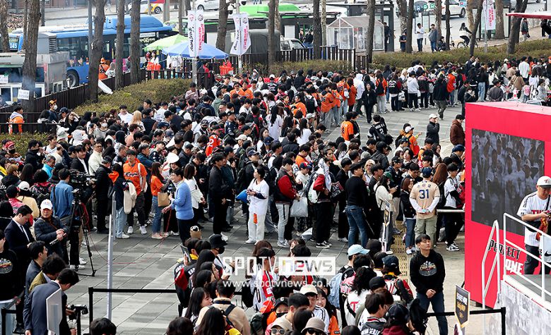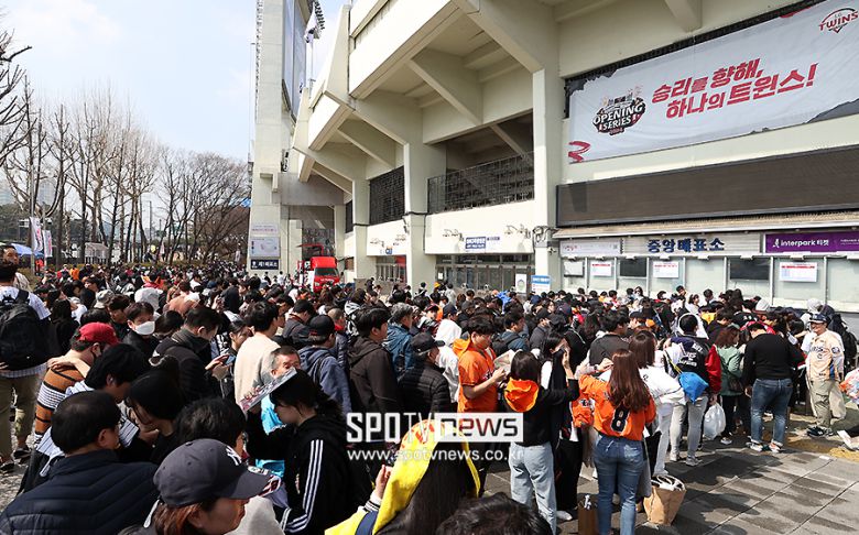 자정에 도착한 야구 팬은 대기열 1번을 놓쳤다. 가장 먼저 도착한 사람은 30대 중반 야구 팬 탁희영 씨. 친구 두 명과 함께 셋이 22일 밤 9시부터 대기했다고 했다. 탁희영 씨는 "야구 보고 싶어서"라고 짧게 이유를 댔다. 날씨가 춥지 않았느냐고 하니 캠핑박스를 가리켰다. 탁희영 씨 일행은 LG가 23일 오프라인으로 판매하기 시작한 '빠더너스' 컬래버레이션 상품도 구매했다.