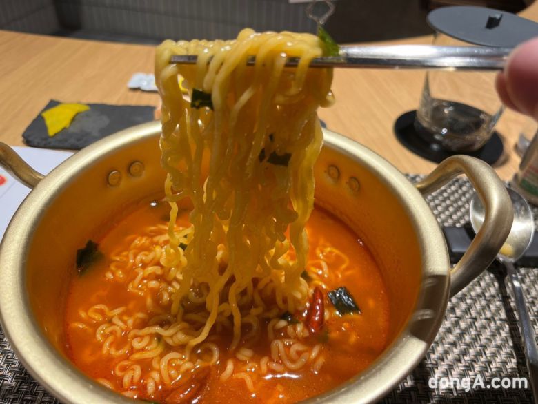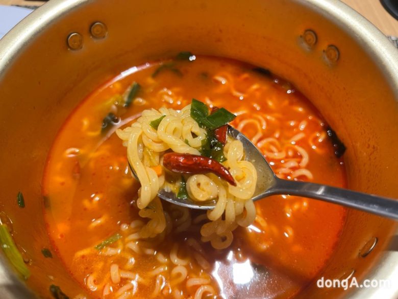 다음으로 면을 먹어보니 쫄깃한 면발에 매콤함이 베어 들어 감칠맛이 느껴졌다. 기름에 뛰긴 유탕면을 사용했는데 매콤한 국물과 궁합이 잘 맞아서 선택했다고 한다. 국물 없이 면만 먹어보니 매콤하긴 했지만, 누구나 먹을 수 있을 정도의 매운맛이었다. 적당하게 매콤해 자꾸 먹고 싶은 중독성 있는 매력적인 맛이다.